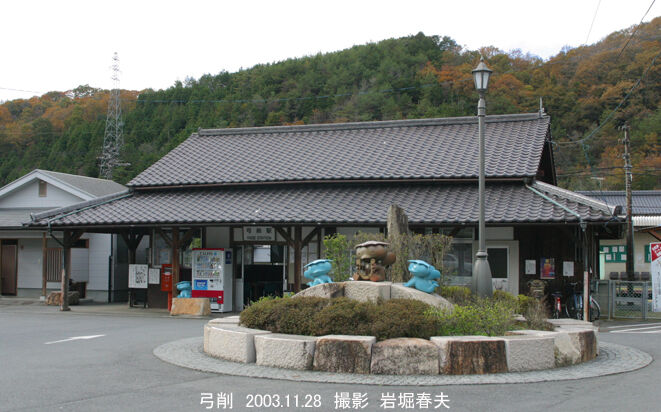 弓削駅は明治31年に開業。古い木造駅舎がリニューアルされている。駅前には町のキャラクターである河童のモニュメントがある。
