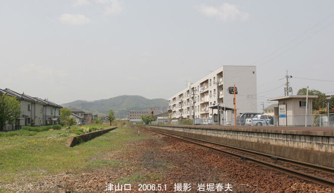 津山口駅の構内は広い。中国鉄道時代のターミナル駅で初代の津山駅だった。ホーム跡も残っている。