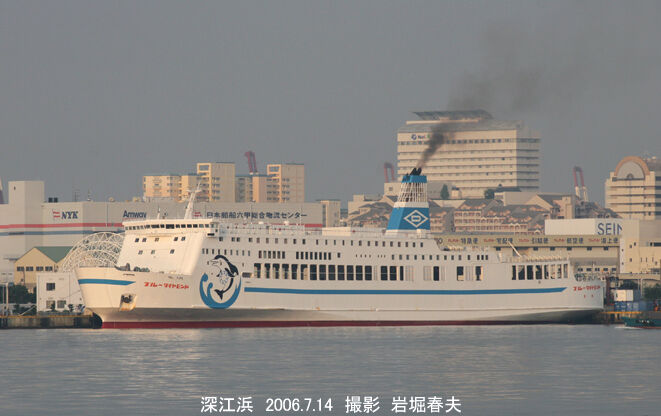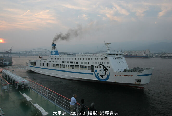 六甲アイランドに到着した「ブルーダイヤモンド」。夏の朝には深江から撮影できる。