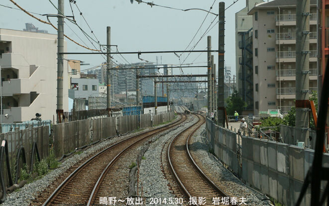 鴫野から放出へ向かう電車の先頭部から撮影した線路。すでに高架新線に移っている。