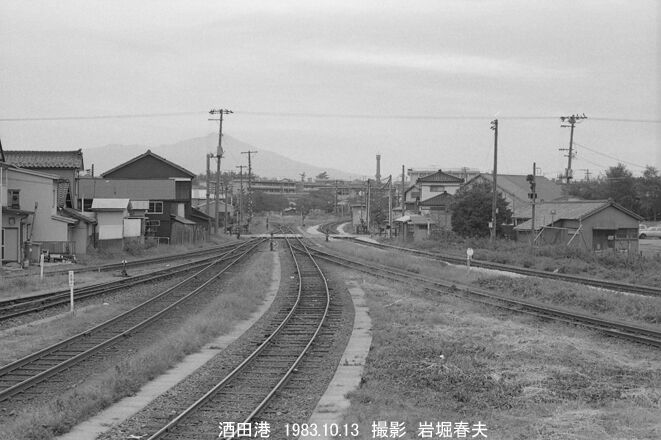 熊手状に線路が広がる酒田港駅の構内。奥の右方向へ酒田駅への貨物線が伸びる。