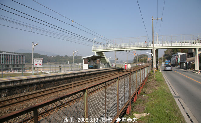 西里駅は信号場だったのが昭和29年に昇格した。駅舎は無くて、待合室がる。道路の歩道橋が駅の跨線橋と兼ねている。