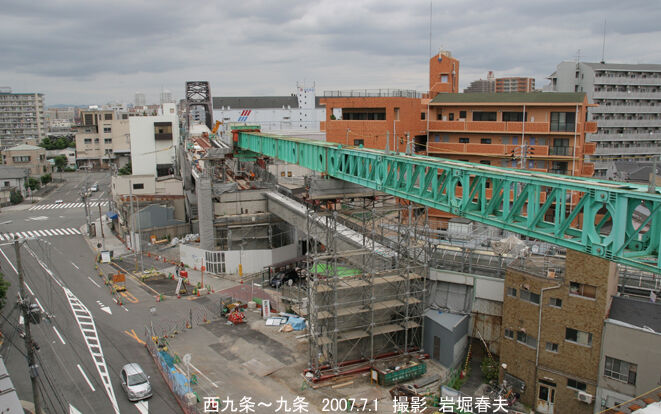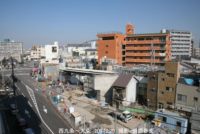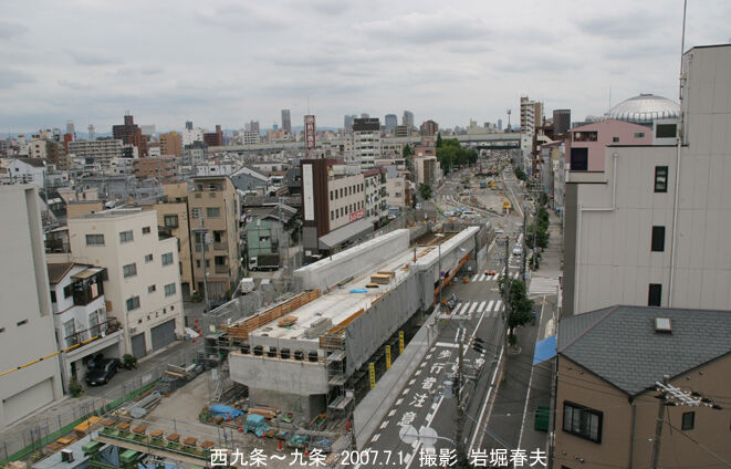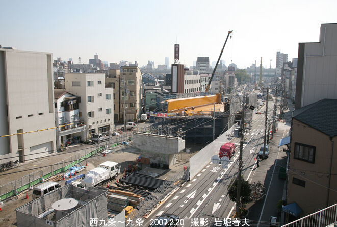地下に潜る区間の工事。地表まで橋梁構造が続く。その先に地下鉄の中央線が見える。地下鉄が高架で、地下を通ることになる。交差部に九条駅ができる。