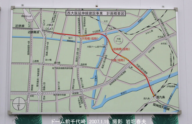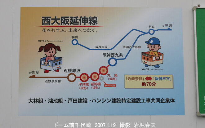 西九条駅の先はJRの環状線を越える高架線を作っていた。それが鉄橋で安治川を渡ってから、地下に向かう勾配線になる。その途中で商店街を分断することになる。昔はこの辺りも賑わっていて、反対運動が起こった。その後、土地を売った方が得だという事になったようだ。大阪市も出資した大阪ドームの赤字がかさみ、阪神を通してタイガースの試合をやればいいという事になった。工事の計画図が貼ってあったが、駅名は当初の予定とはかなり変わっているのがわかる。西大阪高速鉄道は2001年7月10日に設立されて、延伸区間の建設と開通後の第三種鉄道事業をおこなう。