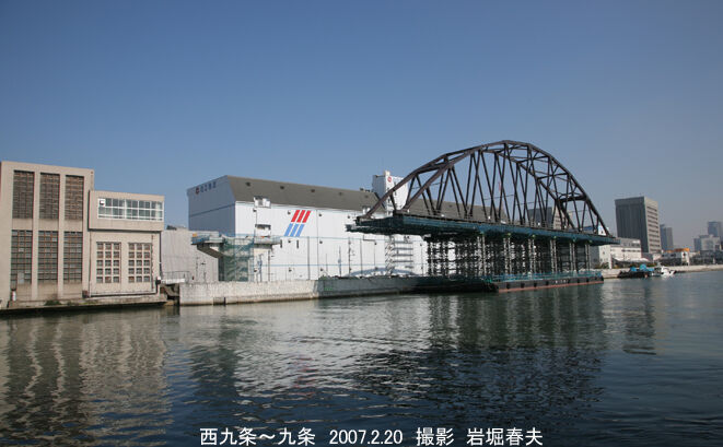 安治川橋梁の架設前。台船上で組まれていて、潮位の上下を利用して架設する。左側の建物は歩行者専用の河底トンネルへのエレベーターがある。戦前には源兵衛渡があった。かつては自動車も通れた。