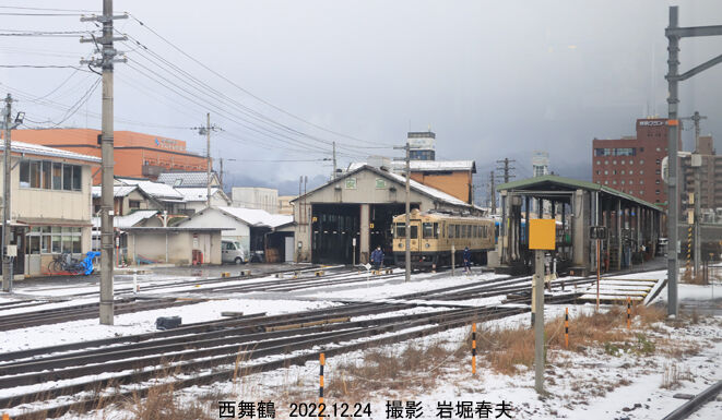西舞鶴駅到着前に京都丹後鉄道の西舞鶴運転区を撮る。かつての西舞鶴機関区で特徴のある矩形庫が残っている。