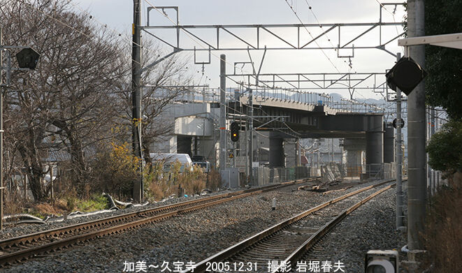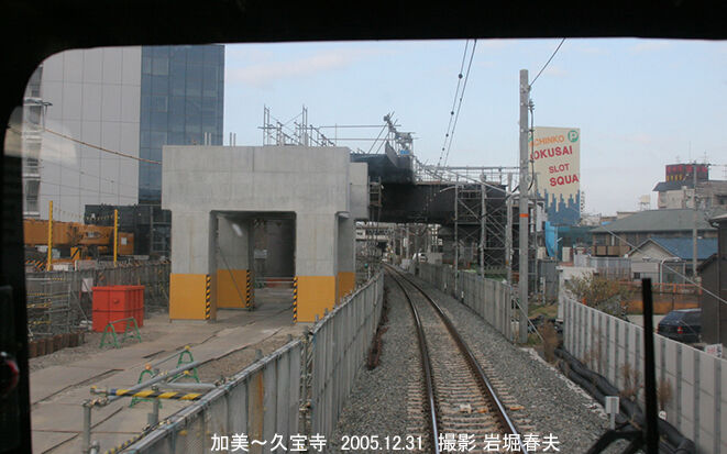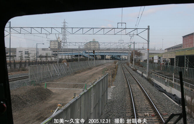 加美駅から久宝寺側の工事を撮っている。かつてのデルタ線は高架複線になって関西本線の上下線間に割り込む形になる。