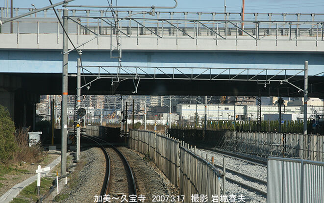久宝寺駅駅が見えてきた。高架駅になり1997年に現在地に移った。その前はもっと手前にあり、上下ホームが操車場を挟んで離れていた。