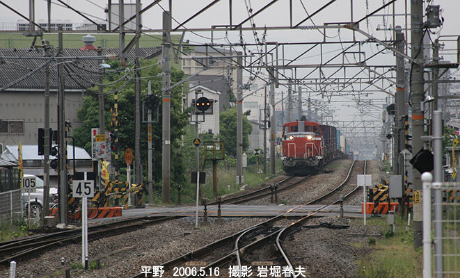 平野駅の下りホーム先端から城東貨物線の下り貨物接近を撮る。DE10の牽引貨物もあった。この区間で関西本線の上り線を逆走している。これを解消する線増工事がその後始まる。