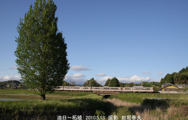 油日駅手前に歩道のある道路橋があり、街並みも入れて撮る事ができた。ここが120周年記念列車運転時に大混雑することになる。