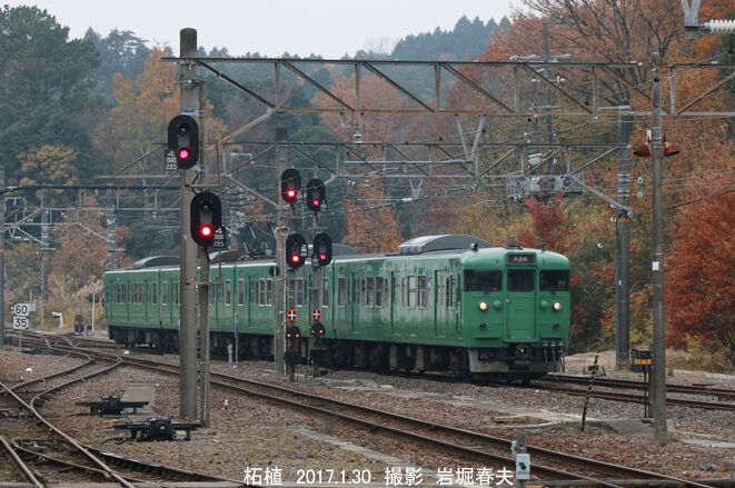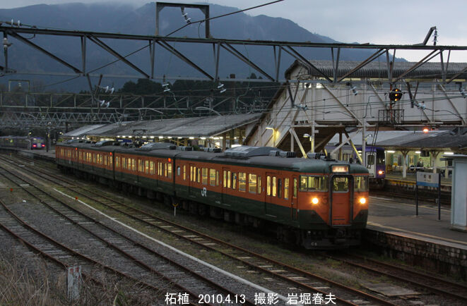 柘植駅に到着する113系の地域色。かつてはバックの部分にSLの駐泊所があった。ターンテーブルの跡が残っている。