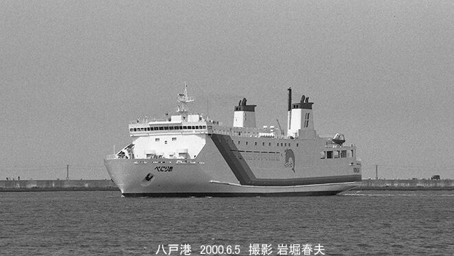 八戸港に入港するべにりあ。バックの防波堤には一般車も乗り入れられた。
