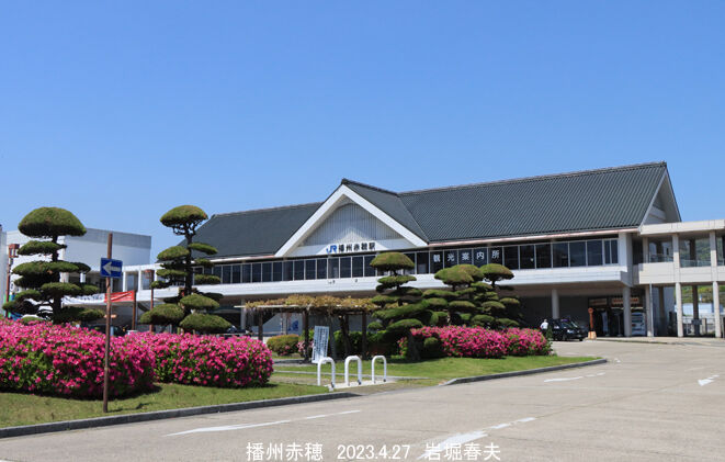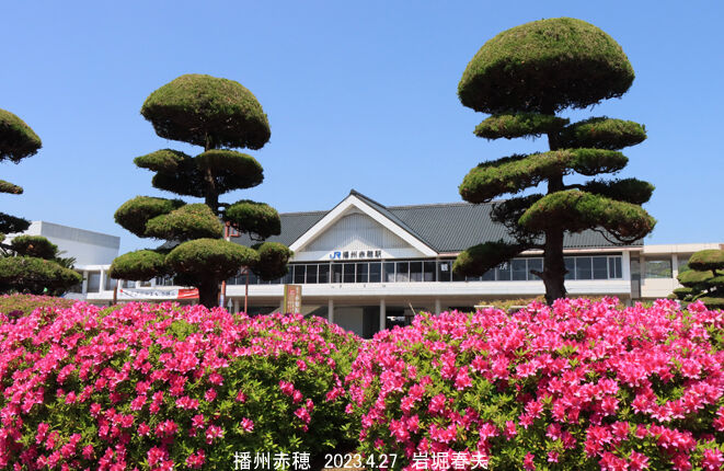 播州赤穂の立派な橋上駅舎は2000年から使われている。ちょうどツツジが満開だった。