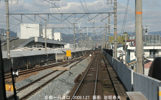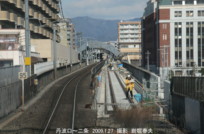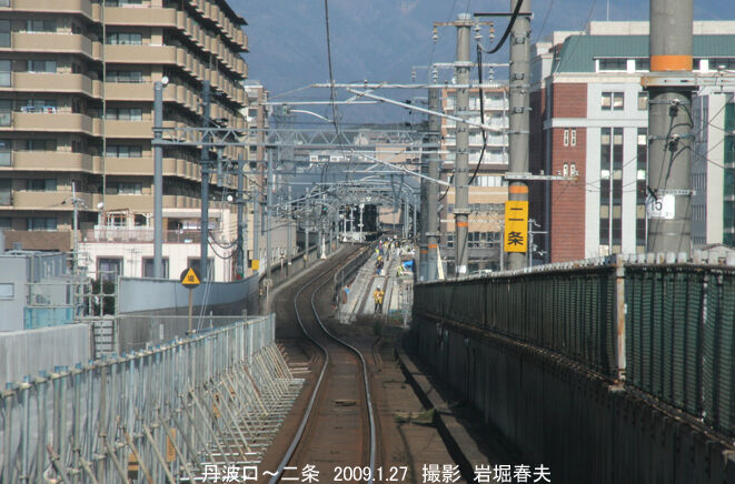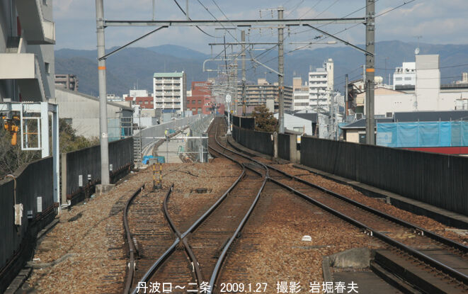 丹波口~二条間の複線化完成は2010年の1月になる。駅間で線路の位置が変わる部分は今でも確認できる。