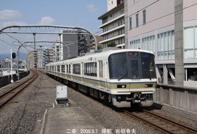 二条駅に到着する221系4連の快速。二条駅の周囲はビルに囲まれていた。二条駅が高架駅になったのは1996年で、2000年9月23日に二条~花園間が複線化される。