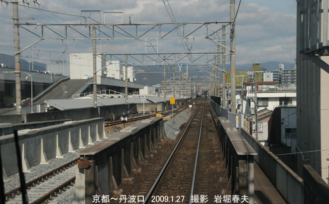 丹波口駅は高架化の時に北側に移転した。駅の構内から複線化工事を見る。