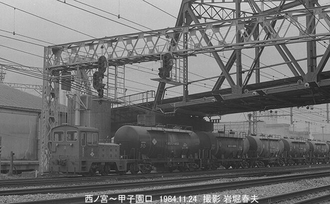 住友セメントの川崎15トン機がタキ1900の若番を牽いてきた。上は阪急今津線の橋梁。