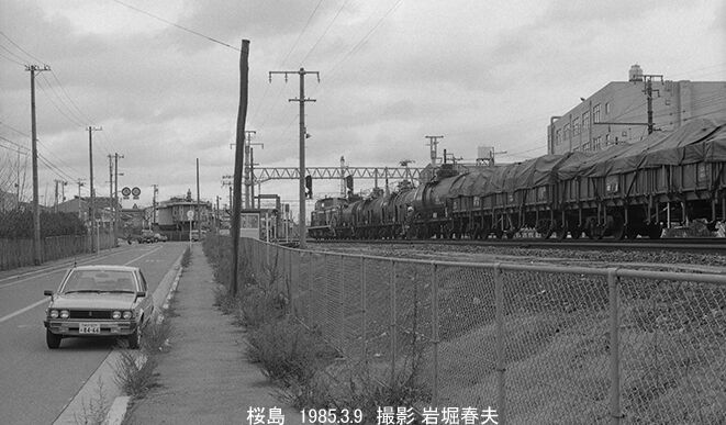 桜島駅の北側から見た貨物列車。この後ろ側に住友金属への引込み線が道を横切っているのだが、それを撮っていないのが残念だった。