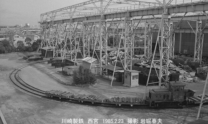 地元の西宮市には非連絡の構内側線がある川崎製鉄阪神製造所がある。いJFEスチール西宮工場である。今も盛業中で80周年のイベントに参加したが構内の線路は無くなっていた。かつては構内で本江製SLが使われていて、昭和30年代から川崎製や日立製のDLが使われていた。本来なら外から見えないのだが、西宮港の南側で西宮浜という人工島の埋め立てがあり、そこへ通じる西宮大橋が完成すると、その歩道から構内がバッチリ見えるようになっていた。