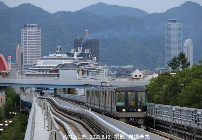 ポートライナーのバックに客船が止まっているのが見えている。移転した水上警察署が邪魔している。右遠方の尖ったビルは新神戸駅の近くにある。