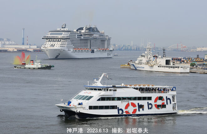 いよいよ入港して歓迎放水が始まる。右の巡視艇は「せっつ」。港めぐりのボンボン神戸も迎えている。船に乗って撮影することもできる。