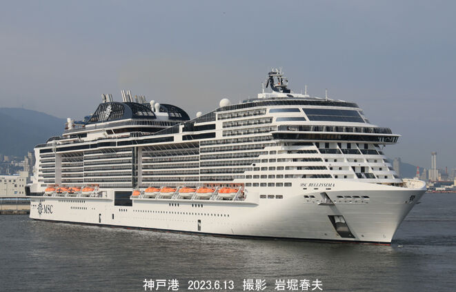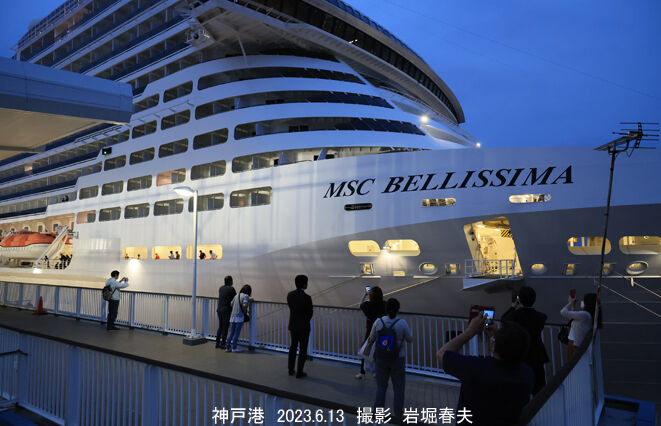 接岸シーンをループ状の道路から撮れる。全長にわたって見物人が並んでいる。広角で撮ると青空になっていた。船名はMSCベレッシマ。