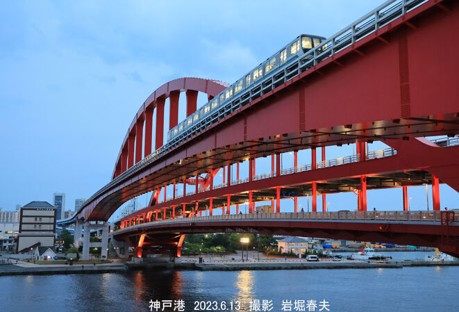 神戸大橋の夕暮れ。ポートライナーが渡っていく。対岸のタグボート桟橋には厳重に入れなくなっている。