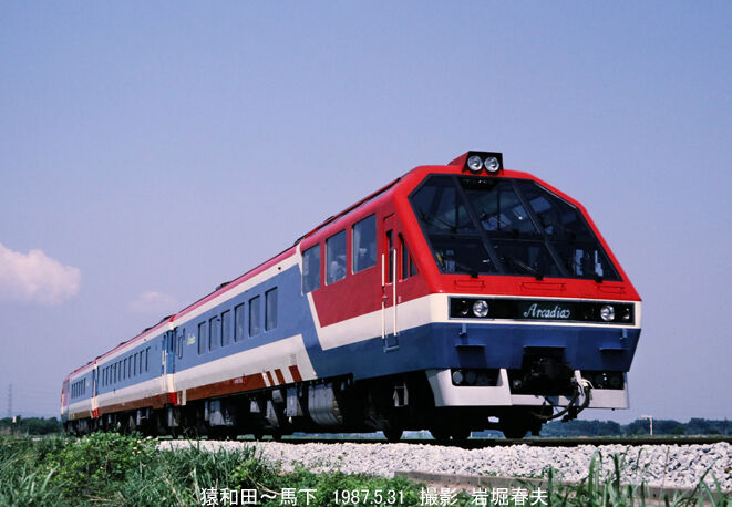 JR東日本 新潟支社の「アルカディア」。ジョイフルトレインは全国にたくさん走っていたが、全部撮ろうとしていた。せっかくうまく撮れても、早くに無くなったのもある。アルカディアは1987年の4月から運転されたが、1988年3月30日に火災を起こした。