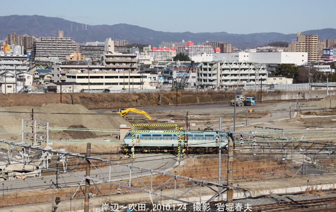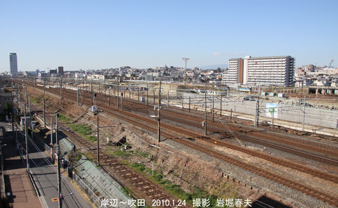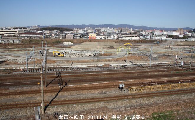 吹田貨物ターミナルは吹田駅から千里丘駅にまでの広範囲になり、その工事の全容を記録することは不可能だった。ほとんどは岸辺駅のホームから撮っていて、さらに吹田駅付近の高層マンションや駅間のマンションから撮影できた。貨物駅の建設と共に操車場跡地には大きなマンションが建ち、岸辺駅は橋上化と共に長い自由通路ができた。