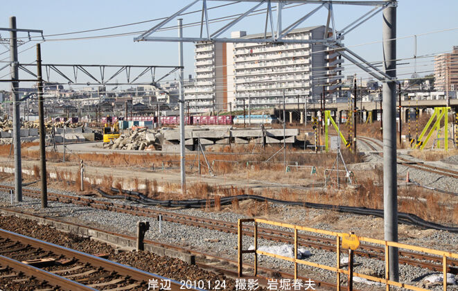 岸辺駅の駅舎はまだ残っているが、その東側で橋上化の工事が始まっている。夜間には工事車両が本線を横切るルートにもなっている。