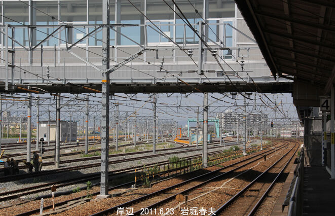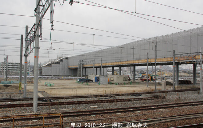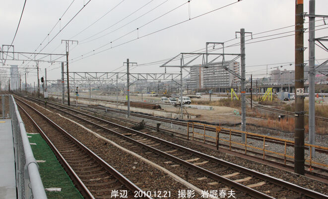 岸辺駅の上りホーム西端から撮影。手前が上り列車線で、さらに吹田機関区の入出庫線が2本ある。その北側で吹田貨物ターミナル駅の工事が進んでいる。