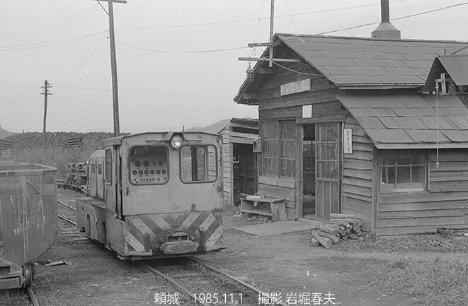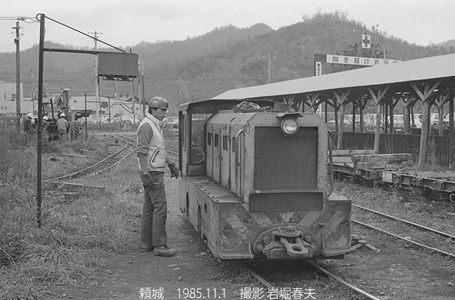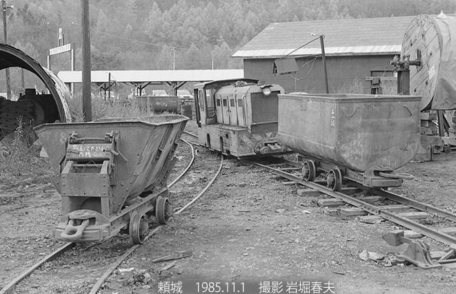 頼城駅の構内で発車を待つ石炭列車。バックに立坑が見え、土場にはナローの線路にDLが使われていた。