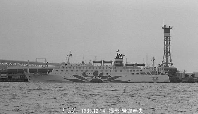 大阪港に停泊していた「さんふらわあ7」。元は関西汽船の阪神沖縄航路で使われたRORO貨客船だったが、改装されてクルーズ客船になった。1990年には大きな水族館の海遊館ができている。