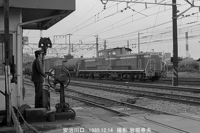 DD51829[吹田] ここでも有人踏切が残っていた。桜島行き貨物はDD51が牽く。