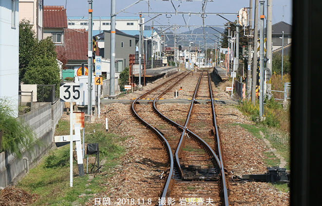 日岡駅に到着する電車の先頭部から撮った構内。1線スルーの様だが、出発信号機は片方にしかない。