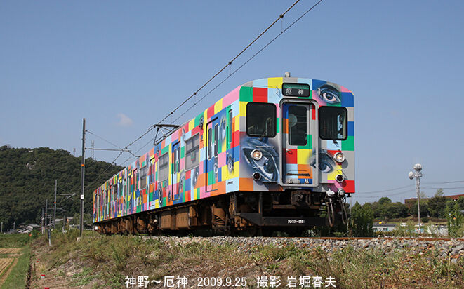電化時から沿線出身の横尾忠則がデザインしたラッピング電車が運転されていた。最初に登場したのが「見る見る速い」で2011年まで運転された。この電車は増備されて4編成ができて、全部撮影するのは大変だった。