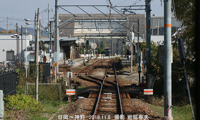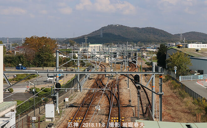 厄神駅から構内を見る。右端に廃止された三木鉄道の廃線跡がある。左の方には加古川線がカーブして、この先で加古川橋梁がある。正面には車両基地があり、さらに遠景の山はNHKのアンテナがあり、正法寺展望広場は有名な撮影ポイントになっている。