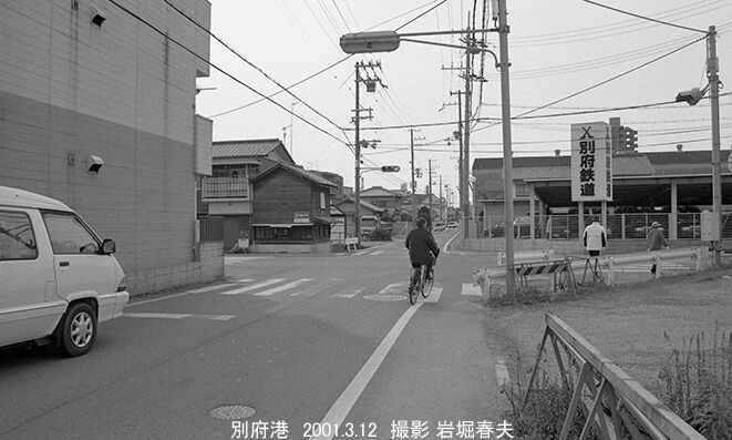 右側に別府港駅があった。交差点は踏切だった。