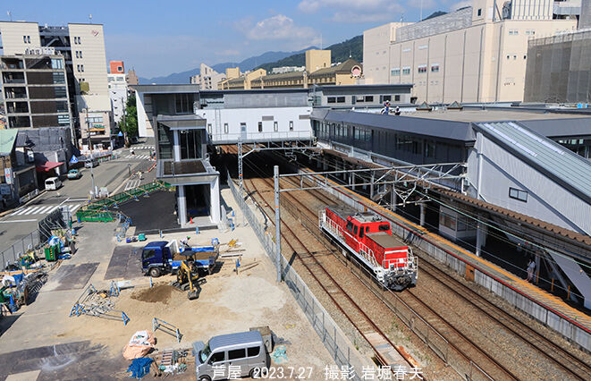 芦屋駅の増床工事は一度完成しているが、南口の再開発があり、工事はまだまだ続く。川崎車両の甲種を迎えに行くDD200が通過する。