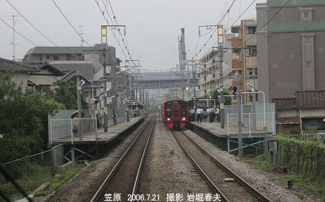笹原駅は国鉄最末期の1987年3月9日に臨時乗降場として開設された。JR九州継承時から駅に昇格された。下り電車先頭部からホームを撮っている。その向こうがでは福岡高速道路が越えている。