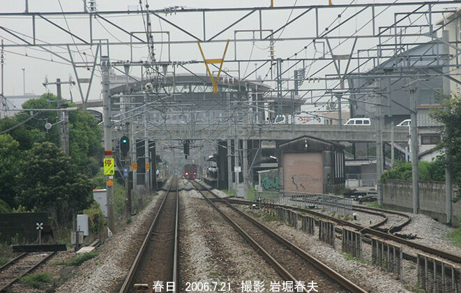 春日駅は1989年に開業し、2003年に橋上駅舎ができた。その手前を道路が越えていて、右側に保線側線がある。