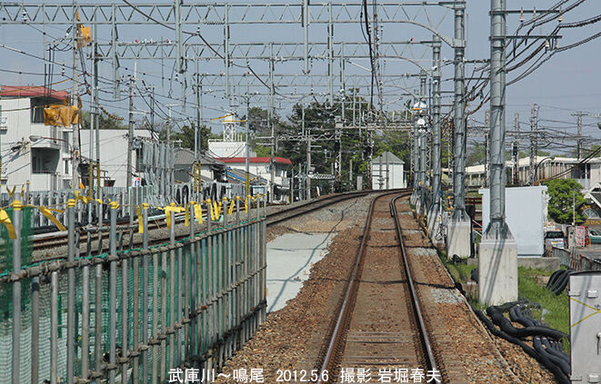 武庫川信号場付近から高架工事区間になる。すでに上り線は仮線に移っている。