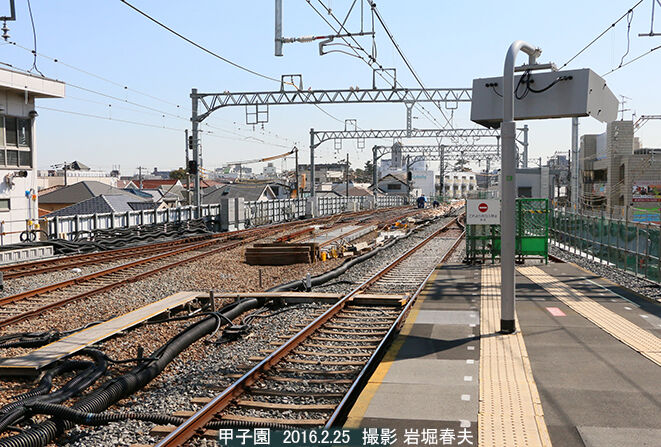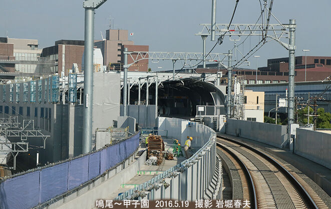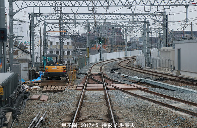甲子園駅側の高架が始まる地点は駅のすぐ近く。ポイント部分ができたが、まだ完成には遠い。