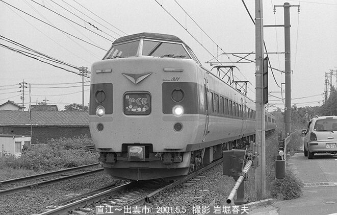 特急「やくも」も通過。381系は伯備線と山陰本線地知井宮まで電化した1982年7月から使われている。リニューアルで塗装の変化があった。これは緑色のラインである。