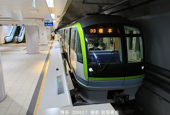 それから夕方に博多に出て、福岡市交通局七隈線を初めて撮ってきた。ほとんど全線乗ったが、ホームドアが出来ていて前面しか取れなかった。運転席の後ろから見ていると、トンネルはギリギリの断面で、単線トンネルの部分もある。
