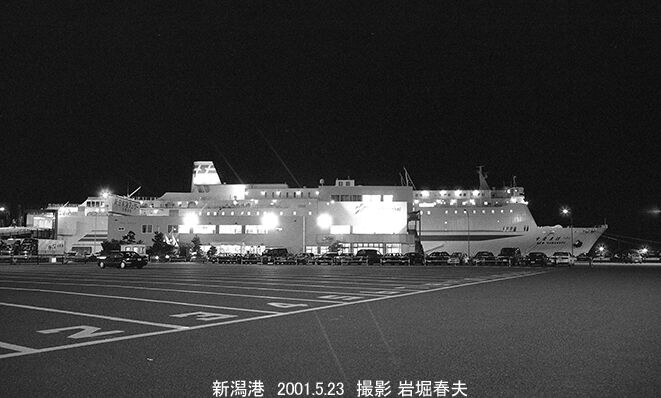 夜の新潟港に接岸する新日本フェリーの「ニューはまなす」。これで北海道へ向かう。