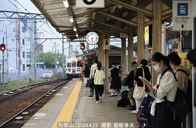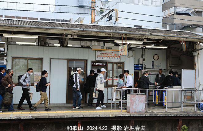 実は和歌山電鐵の電車は和歌山駅に停車シーンを外側から2箇所で撮れる。到着と発車を別の場所から撮ることになり、電車が着くと、移動して両方とる。さらにホームのスナップも撮れる。問題は電車に乗ることで、どこかからJRに乗って行けば問題はないのだが、和歌山駅から乗る場合は困ることになる。それで夕食の時に入場券を買って中に入り、和歌山電鐵の切符売り場で聞いてみた。問題は一日乗車券を買う時だが、改札口で申し出ると無札で入場できるようだ。ところが東口は駅員がいないこともある。その場合はインターホンで頼むことになるようだ。運よく翌朝は駅員がいたので中に入り1日乗車券を買うことができた。