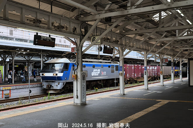 EF210150の牽く上り貨物が通過。岡山駅では貨物の通過案内もある。ホームの屋根はまだ木造の骨組みが残っている。