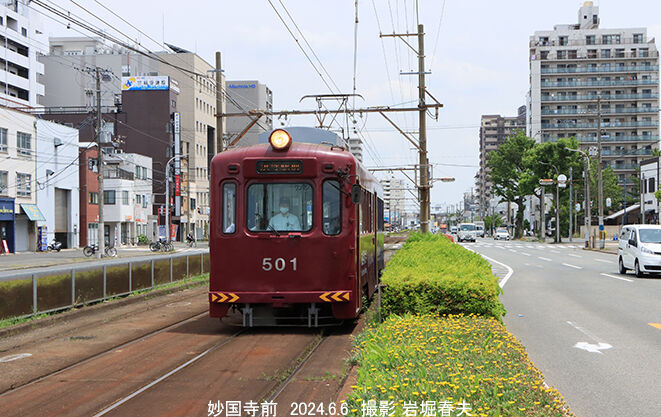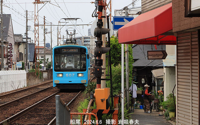 602 石津川を渡る路面電車。ここで広告を撮りたくもないが、ずっと待つこともできない。もう一本も広告車だった。