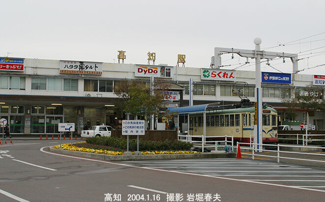懐かしい地上時代の高知駅。土佐電鉄の停留所は2001年に駅正面に移設されていた。新しい高架駅は旧駅構内の北側にできた。